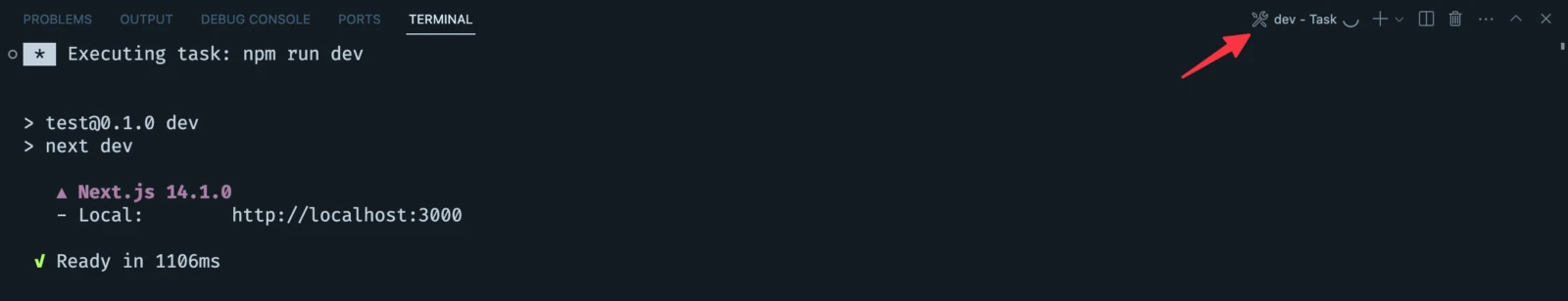 I selected the npm: dev option to start my development server and automagically VS Code opened up a terminal with the command already executing. In the upper right corner it even added a proper label for the currently running task.