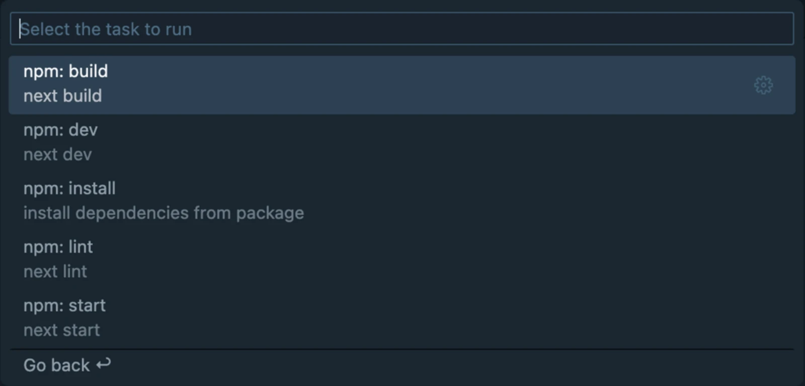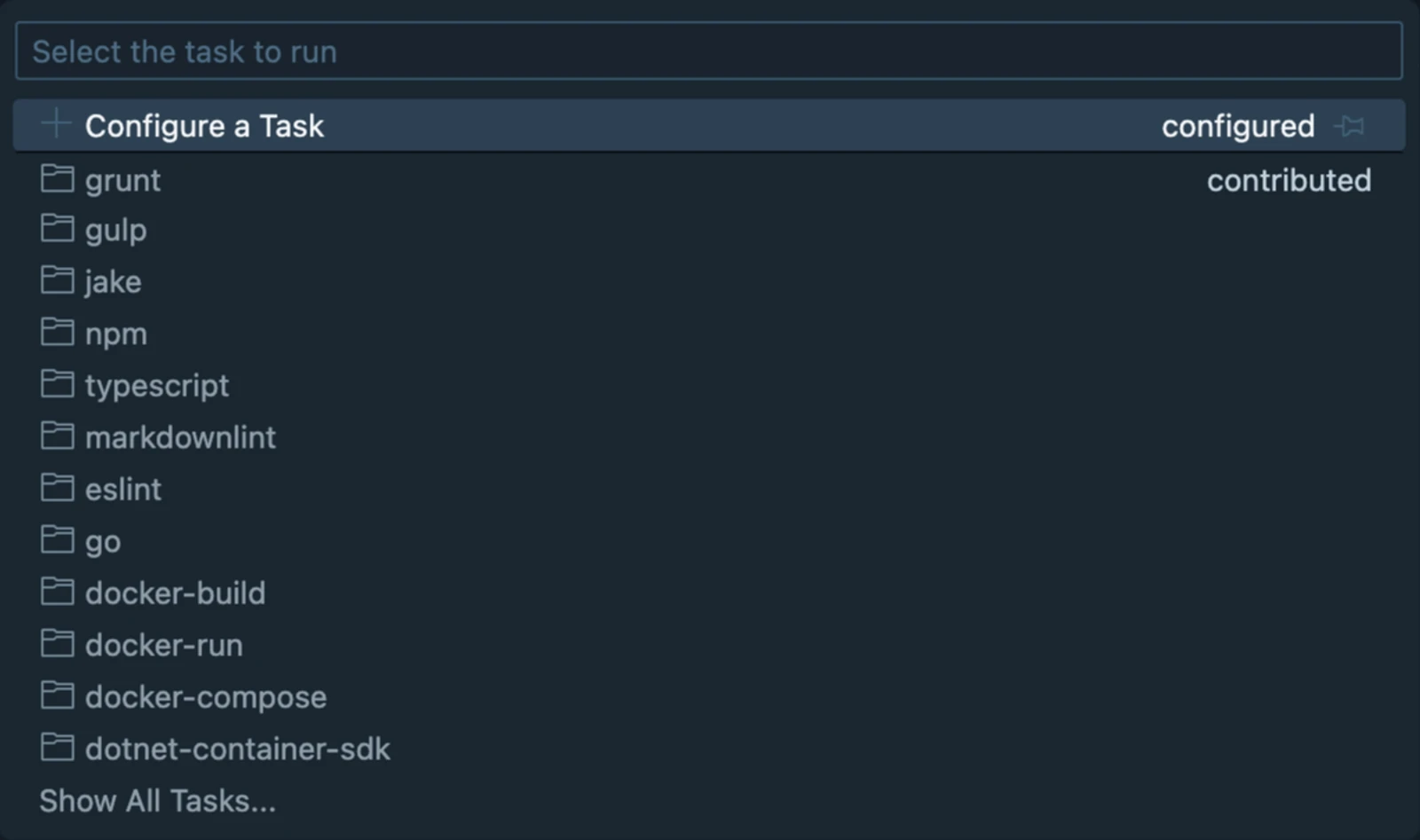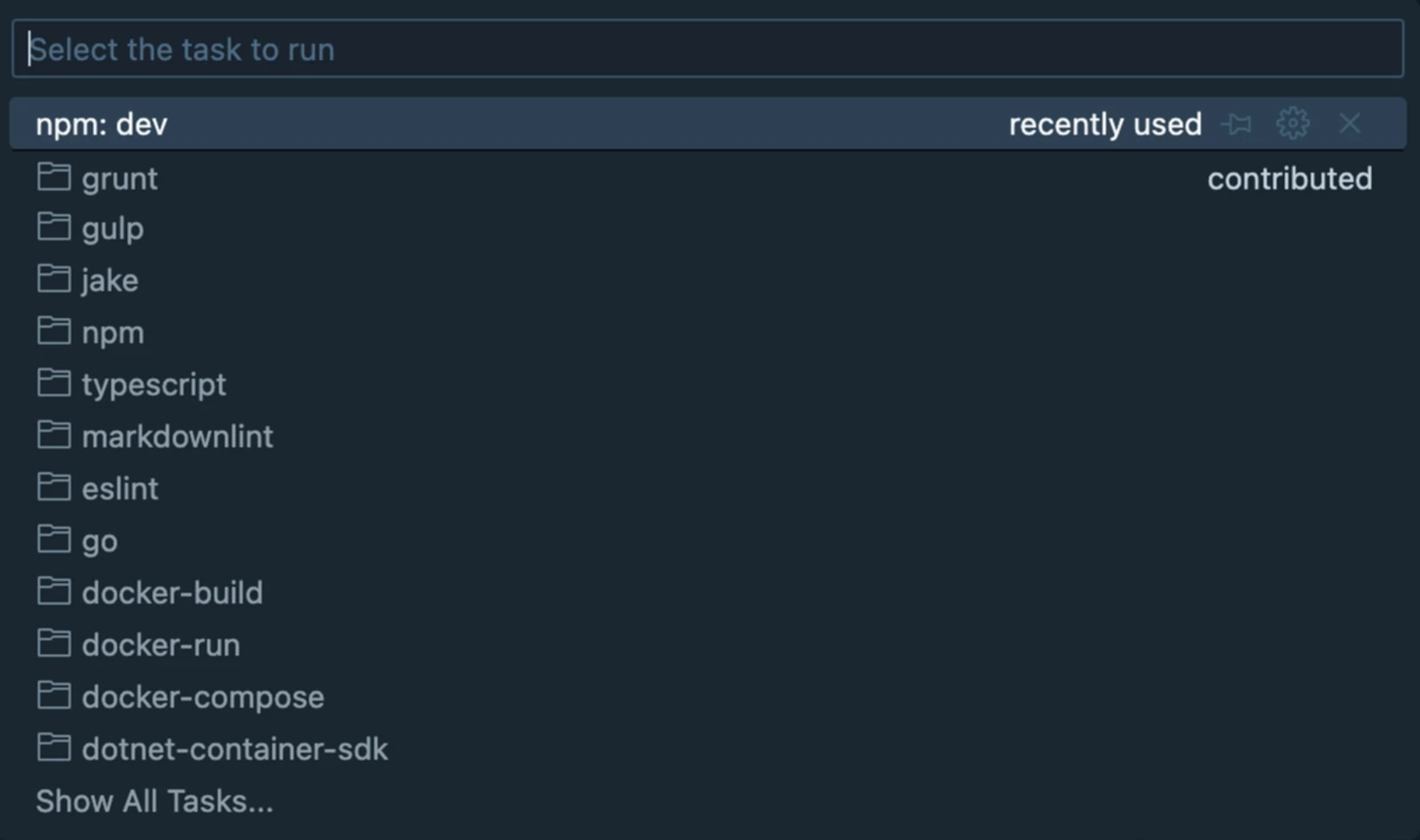 To see and run the auto-detected Tasks, simply open up your command palette with Command/Ctrl Shift p and type in run task. Select the option that says Tasks: Run Task.