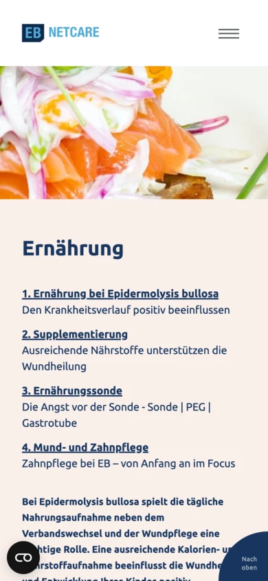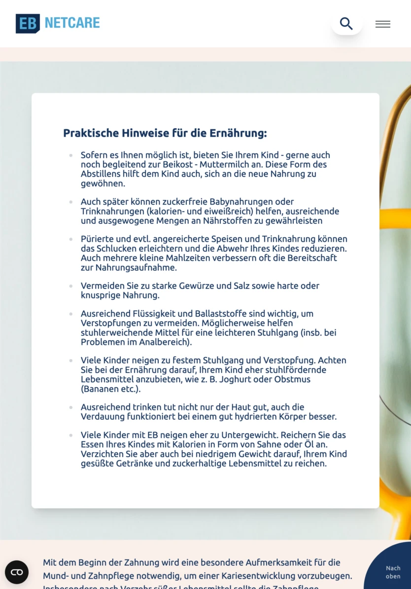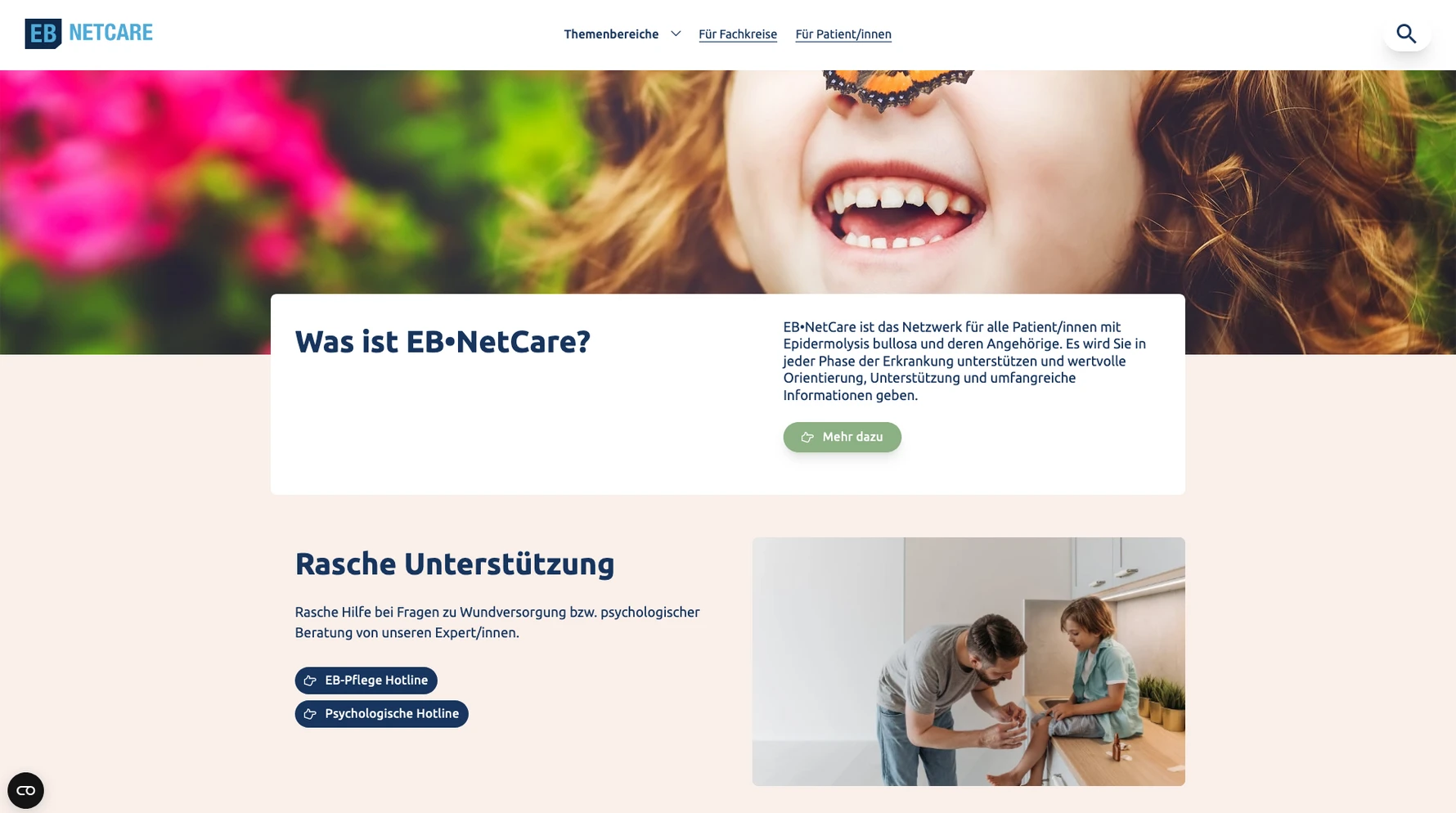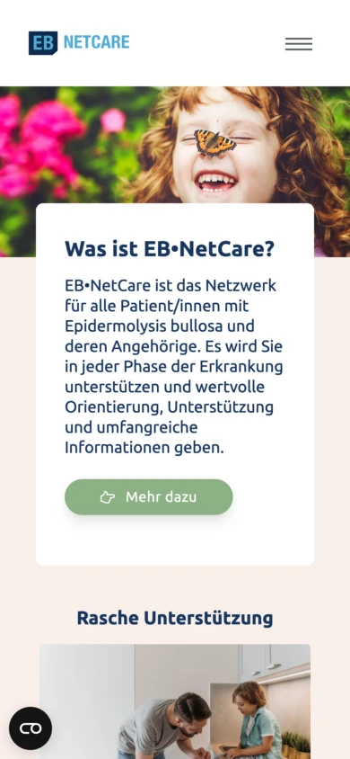 Die Webseite von EB•NetCare dient als zentrale Anlaufstelle und unterstützendes Netzwerk für Patientinnen und Patienten, die an Epidermolysis bullosa leiden, sowie für deren Angehörige.